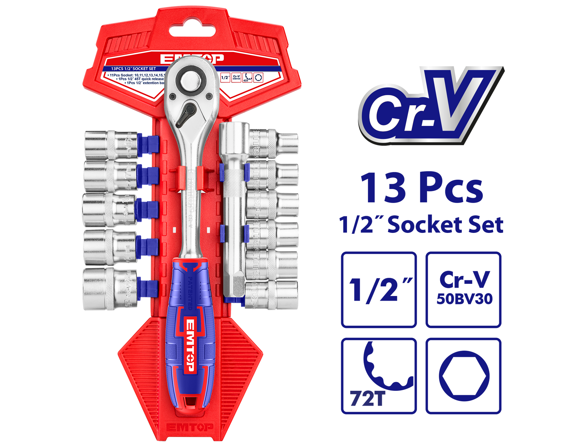 13 ədəd 1/2" açar dəsti11 ədəd : 10, 11, 12, 13, 14, 15, 16, 17, 19, 21, 24 mm1 ədəd 1/2" 72T sürətli buraxma ratchet tutacaq1 ədəd 5" uzatma şaftıMaterial: 50BV30 yüksək keyfiyyətli Cr-V poladıİstilik müalicəsiXrom örtüklüÜç rəngli yumşaq tutacaqlaQablaşdırma: plastik asqı ilə