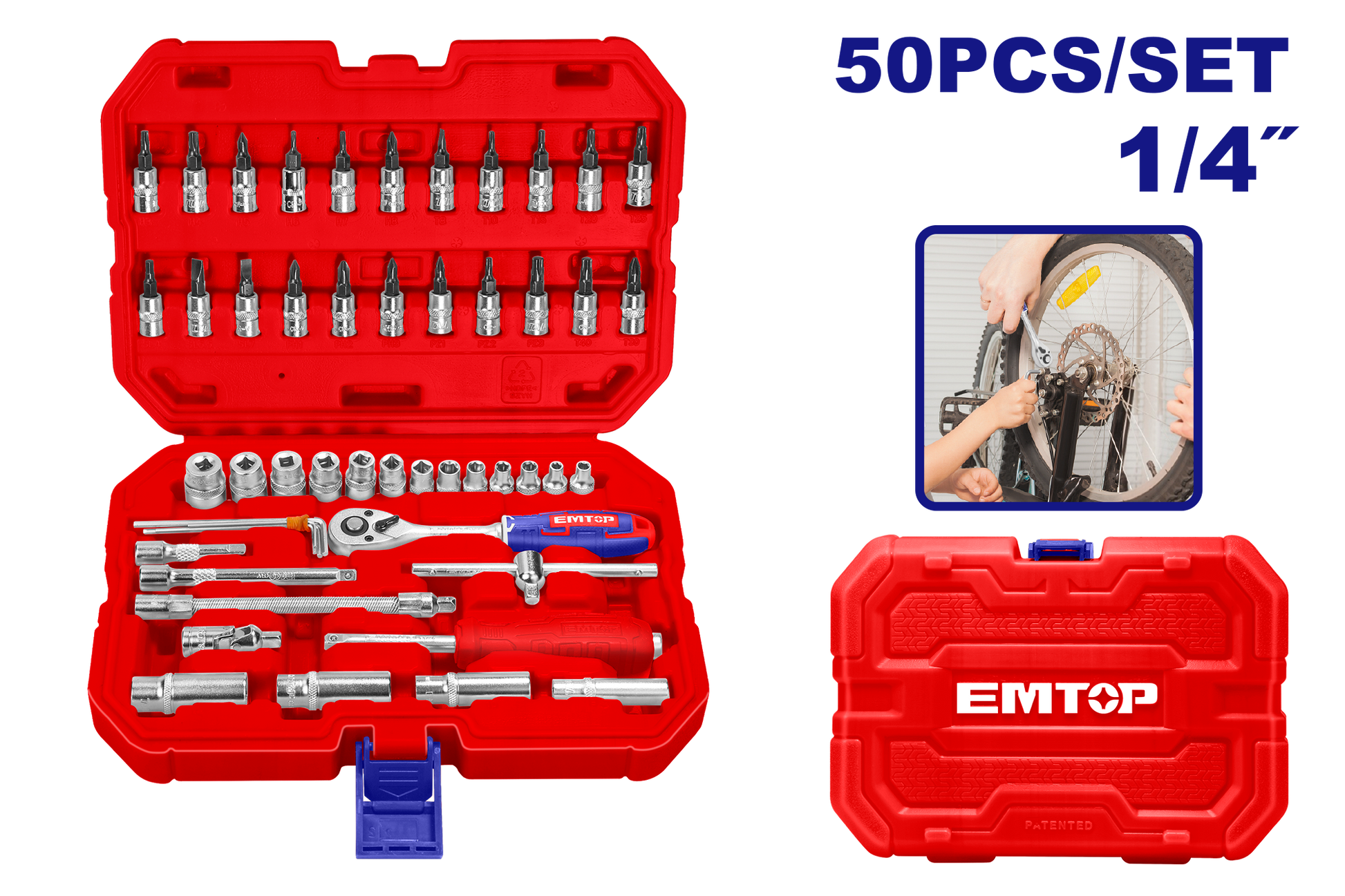 EMTOP 50 ədəd 1/4" açar dəsti1 ədəd 1/4" ratchet açar, 45T13 ədəd 1/4" sürücülü lokma: 4, 4.5, 5, 5.5, 6, 7, 8, 9, 10, 11, 12, 13, 14 mm1 ədəd 1/4" universal birləşmə2 ədəd 1/4" uzatma şaftı: 50 mm və 100 mm1 ədəd 1/4" × 150 mm spinner tutacaq1 ədəd 1/4" × 150 mm elastik uzatma şaftı1 ədəd 1/4" × 114 mm sürüşən T tutacaq4 ədəd altıbucaqlı açar: 1.5, 2.0, 2.5, 3.0 mm22 ədəd 1/4" bit : H3, 4, 5, 6, 7, 8 T8, 10, 15, 20, 25, 30, 40 SL4, 5.5, 7 PH1, 2, 3 PZ1, 2, 34 ədəd 1/4" dərin: 8, 10, 12, 13 mmMaterial: CR-V (50BV30), istilik müalicəliQablaşdırma: plastik qutu ilə