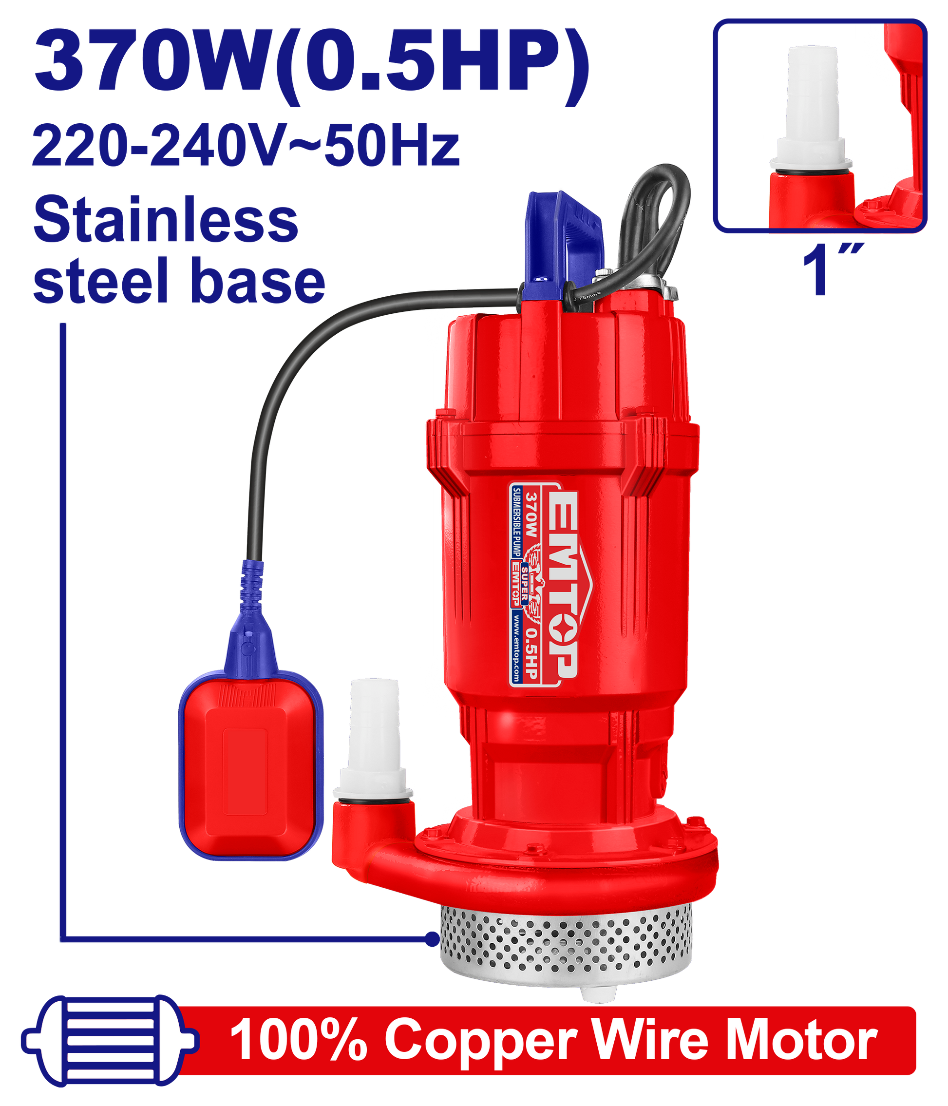 Emtop Gərginlik: 220-240V~50HzNominal güc: 370W (0.5HP)Maksimum baş: 17mMaksimum axın: 100L/dəqBorunun diametri: 1"9m uzunluğunda kabelMis tel mühərrikPaslanmaz polad bazaPaslanmaz polad vintlərPaslanmaz polad oxİstilik qorunmasıFloat switch iləTəmiz su üçünKarton qutuda qablaşdırılmış