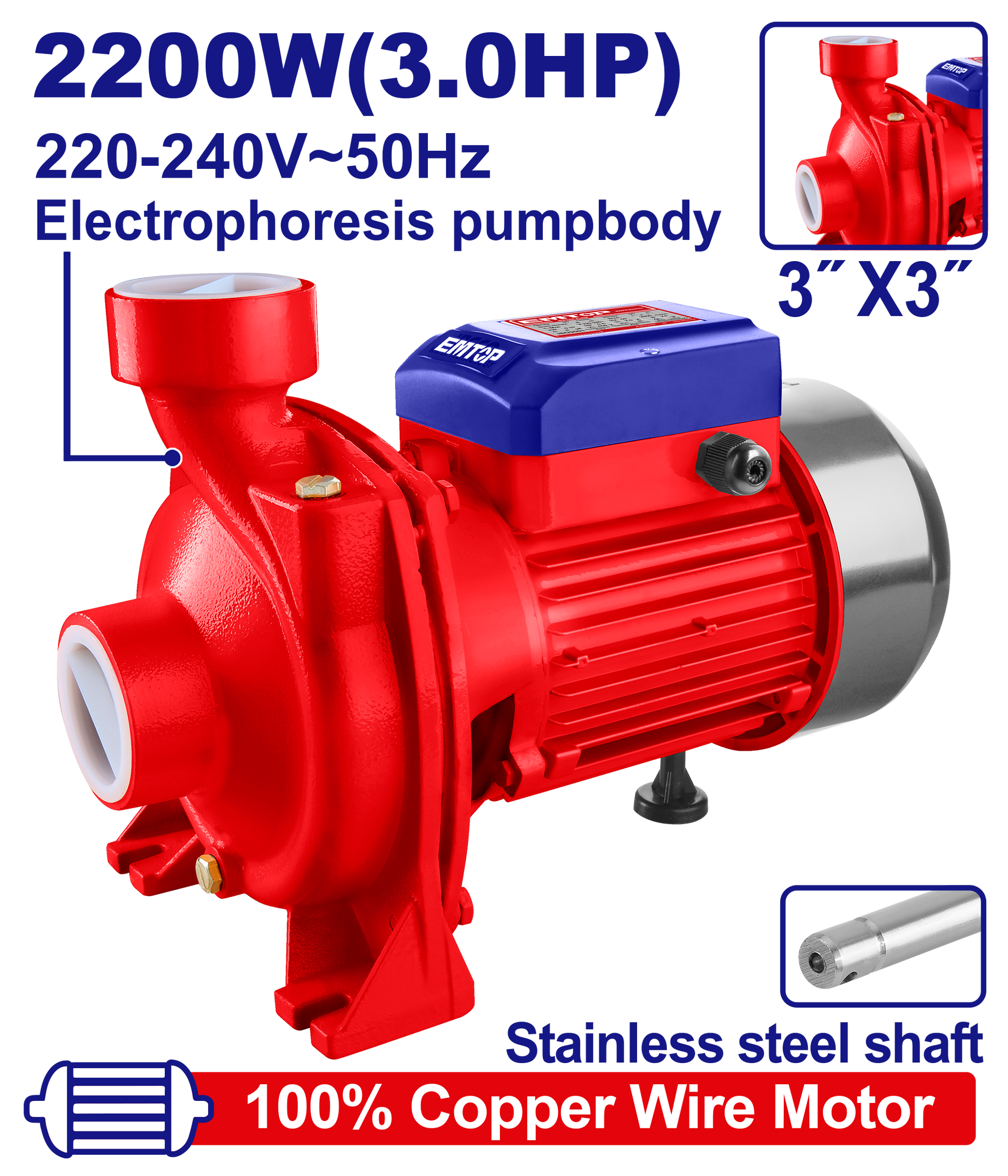 Emtop Mərkəzi nasosGərginlik: 220-240V~50HzNominal güc: 2200W (3.0HP)Maksimum yüksəklik: 15mMaksimum axın: 800L/dəqMaksimum udma: 8mBorunun diametri: 3" x 3"Mis tel mühərrikPaslanmaz polad qaynaq mili: 304+45#Elektroforez nasos korpusuPaslanmaz polad impeller0.3m uzunluğunda kabelDəmir taxta qutuda qablaşdırılmış