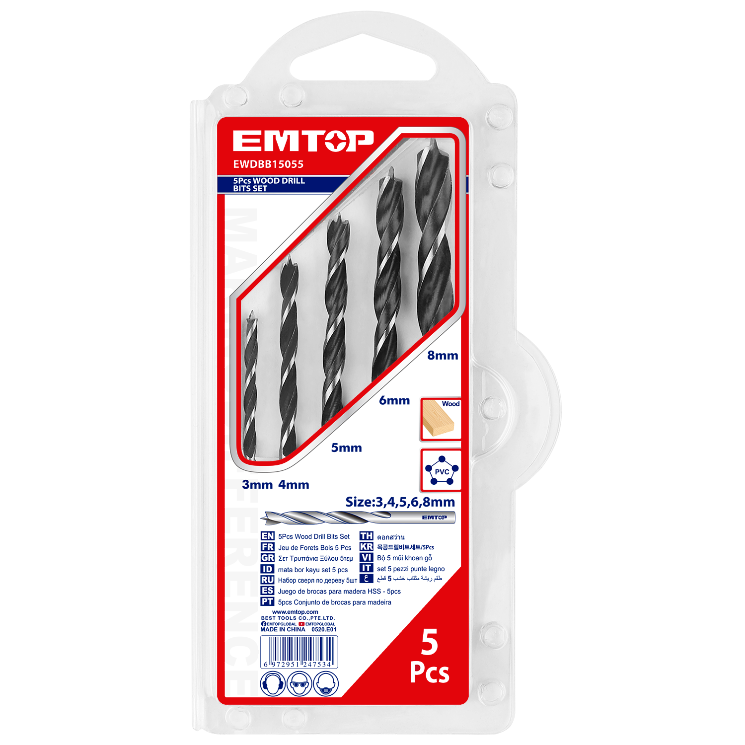 Emtop 5 ədəd taxta burğu dəsti Ölçülər: 3X61, 4X75, 5X86, 6X93, 8X117 mm İkiqat blisterdə qablaşdırılmışdır