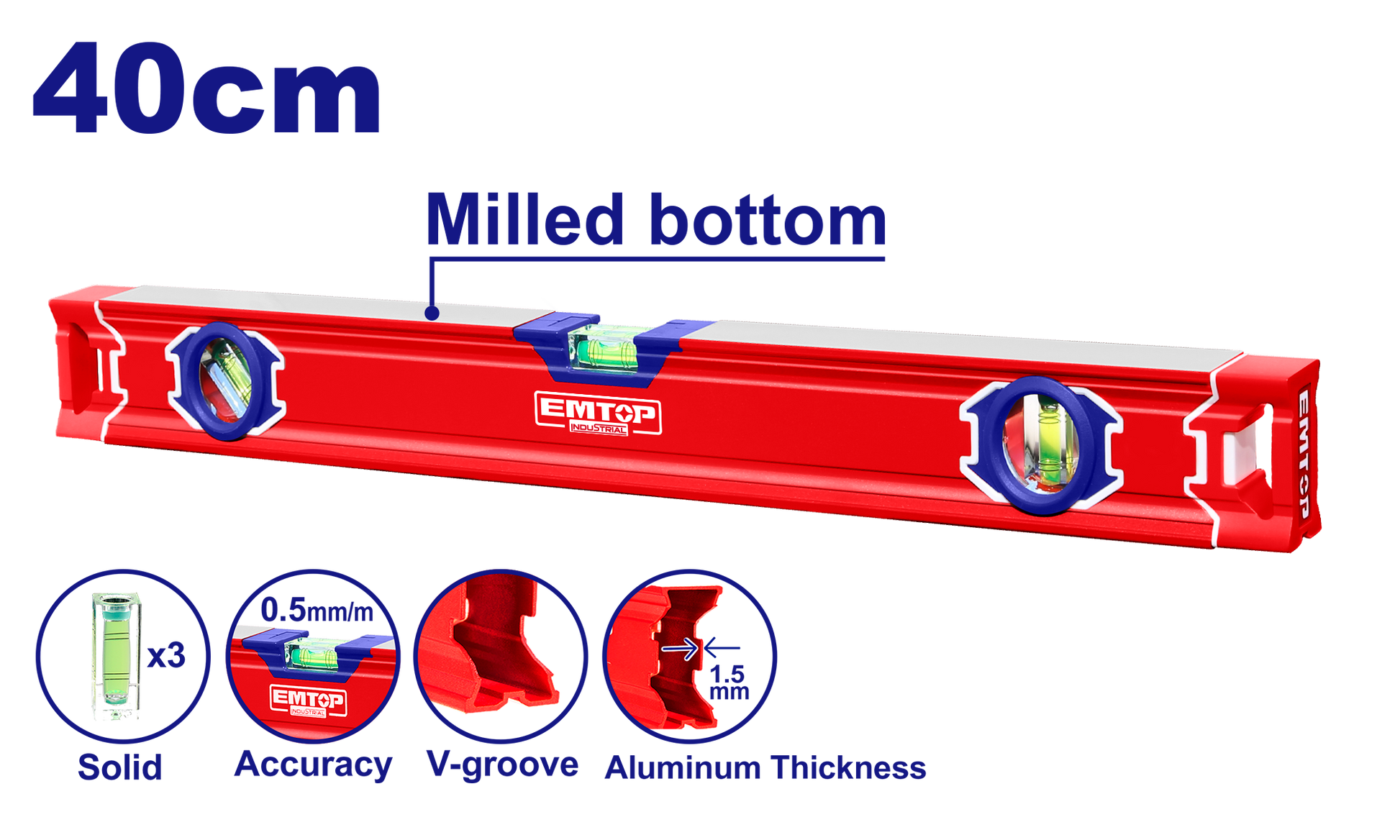 Uzunluq: 40 sm İki tərəfi frezələnmiş Dəqiqlik: 0.5 mm/m olan flakonlar Qalınlıq: 1.5 mm V-formalı yiv: Dairəvi səthləri ölçmək üçün nəzərdə tutulub Qablaşdırma: Rəngli üzlük ilə qablaşdırılmışdır
