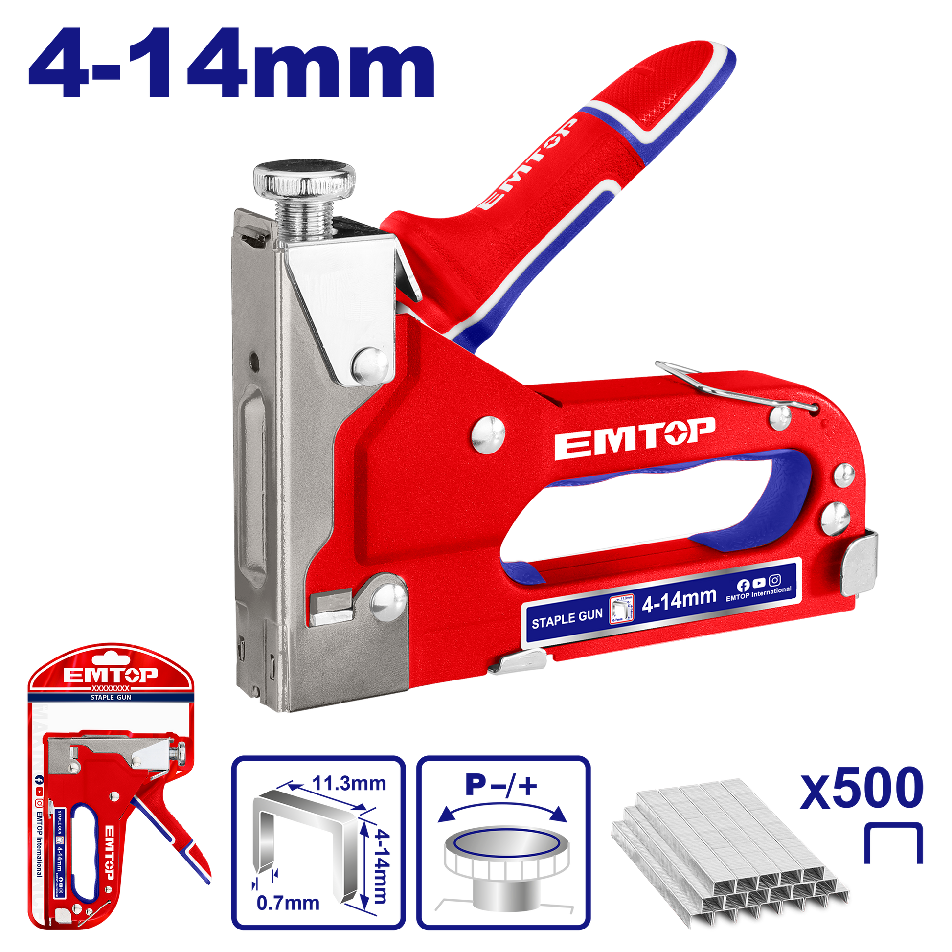 Tikinti stapler alətiXüsusiyyət: Tənzimlənən vurma gücüTel qalınlığı: 0.7mmTaç eni: 11.3mmUzunluq: 4-14mmDaxildir: 500 ədəd staplerQablaşdırma: İkiqat blister ilə