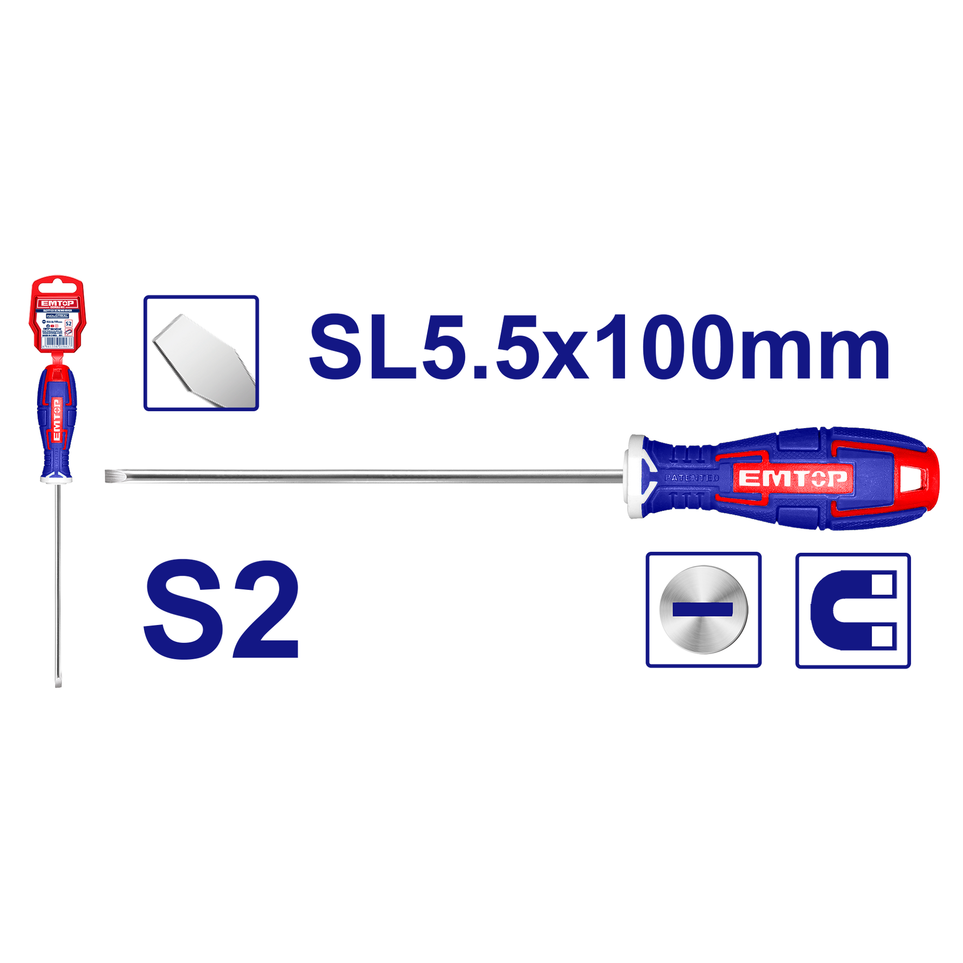 Emtop 1 ədəd tornavida ilə 1 ədəd plastik askı S2, Dairəvi sap Sürüşən: 5.0mm Diaqonalı: 5.0mm Uzunluq: 100mm Plastik askıda qablaşdırılıb