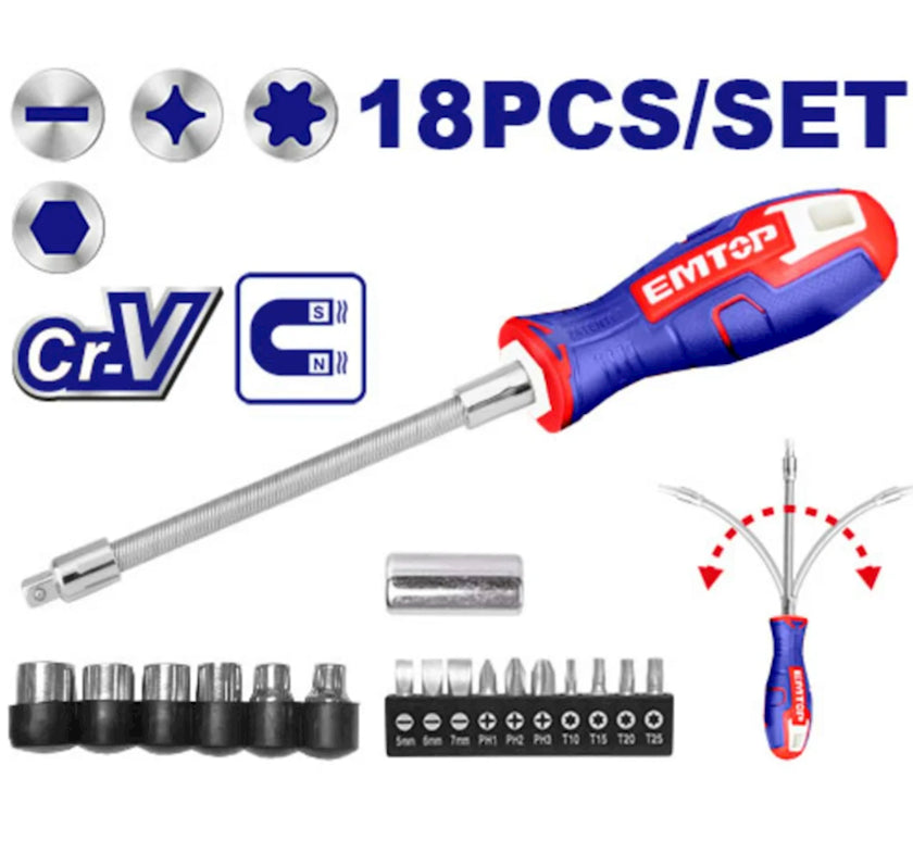 Emtop 18 ədəd elastik şaft vida açarı dəstiDaxildir:1 ədəd elastik şaft sapı1 ədəd 4-6mm (25mm) bit adaptoru6 ədəd 1/4'' altıguşəli soket:5mm, 6mm, 8mm, 9mm, 10mm, 11mm10 ədəd 6.35X25mm vida açarı bitləri:SL5, SL6, SL7, PH1, PH2, PH3, T10, T15, T20, T25Yarım ikili blisterdə qablaşdırılmış