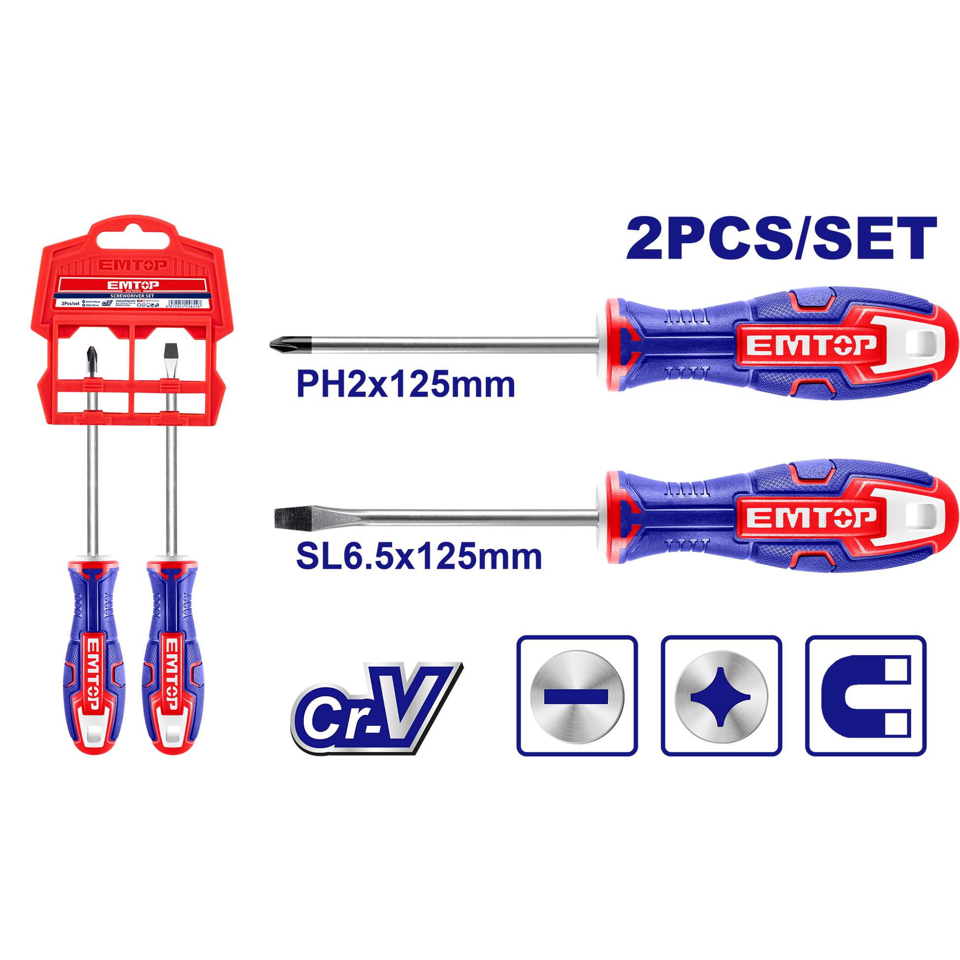 Emtop 2 ədəd tornavida dəsti Material: CR-V Dairəvi bıçaq 1 ədəd SL6.5*6*125 1 ədəd PH2*6*125 Plastik asqıda qablaşdırılmış