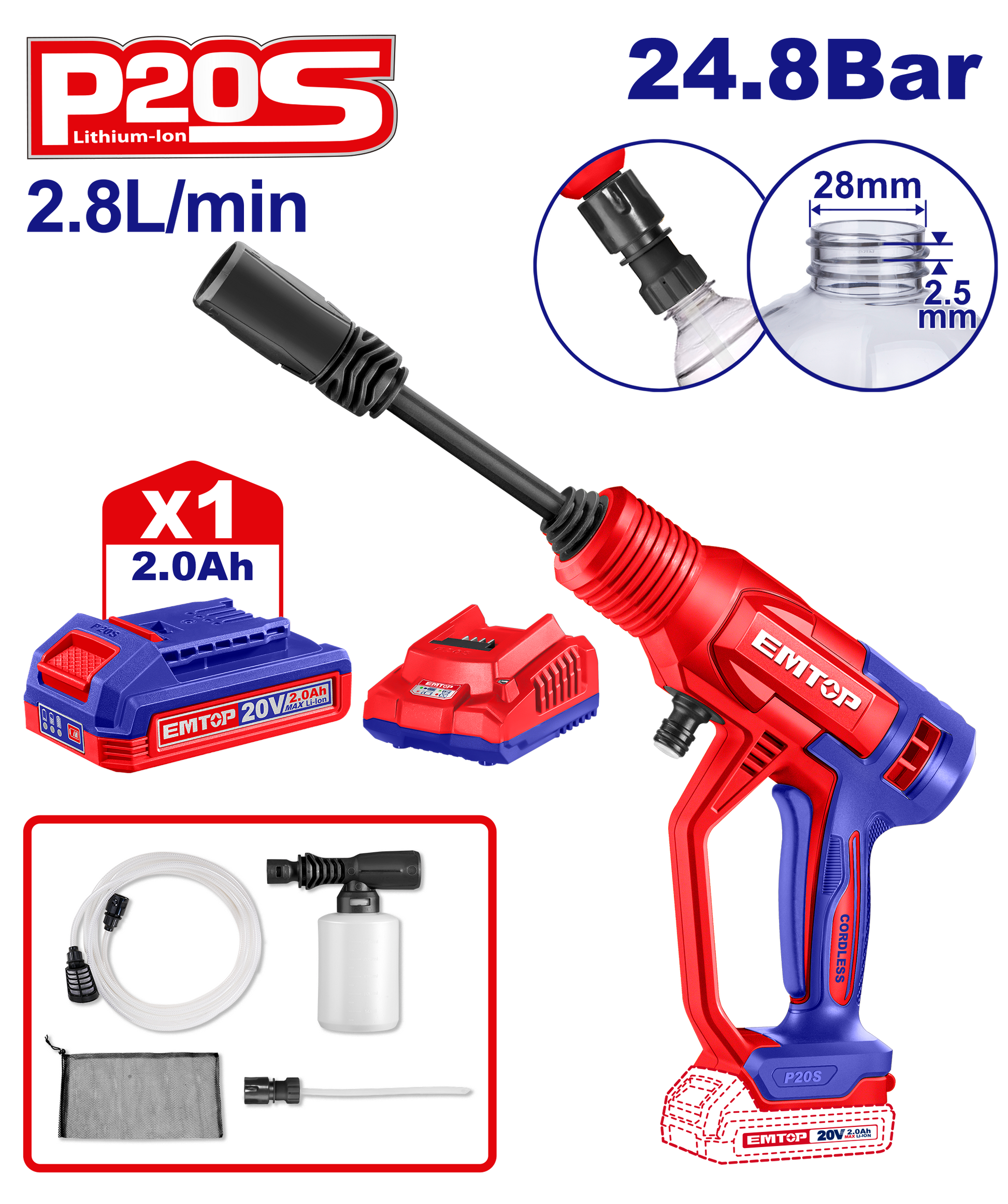 Gərginlik: 20VMaksimum təzyiq: 24.8BarAxın sürəti: 2.8L/dəqAvtomatik dayandırma sistemiDaxildir: 1 dəst 2 nümunəli püskürtücü 1 ədəd 6m su giriş şlanğı ilə sürətli qoşulma 1 ədəd 300ml köpük istehsalçısı 1 ədəd özünü udma qoşulması 1 ədəd portativ çanta 1 ədəd 2Ah batareya paketi (EBPK20011) 1 ədəd şarj cihazı (EFCR20200)Şarj gərginliyi: 220-240V~50/60HzRəngli qutuya yığılmışdır