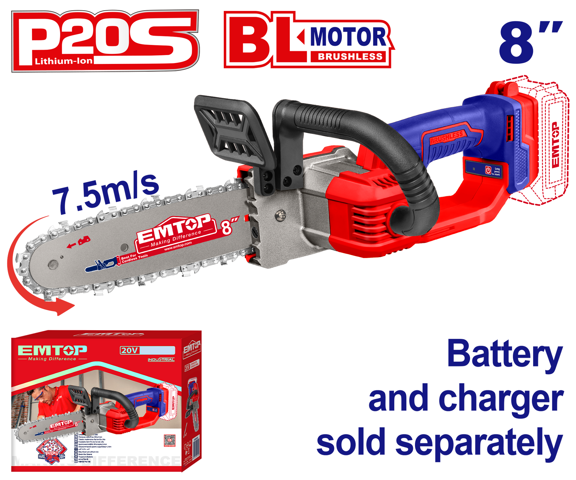 Fırçasız motorGərginlik: 20VZəncir uzunluğu: 8"Zəncir sürəti: 7.5 m/sDaxildir: 1 ədəd açar, 1 ədəd boş yağ qabıBatareya və şarj cihazı ayrıca satılırRəngli qutu ilə qablaşdırılıb