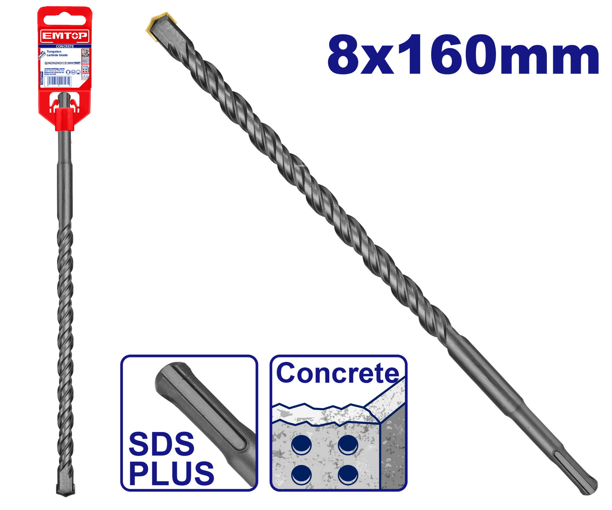 Ölçü: 8x160mm, SDS plus Bərkidilmiş karbid başlıq: Ucluğun gücünü artırır və məhsulun uzun ömürlü olmasını təmin edir Uyğun istifadə sahələri: Kərpic, beton və digər deşmə əməliyyatları Qablaşdırma: Plastik askıda