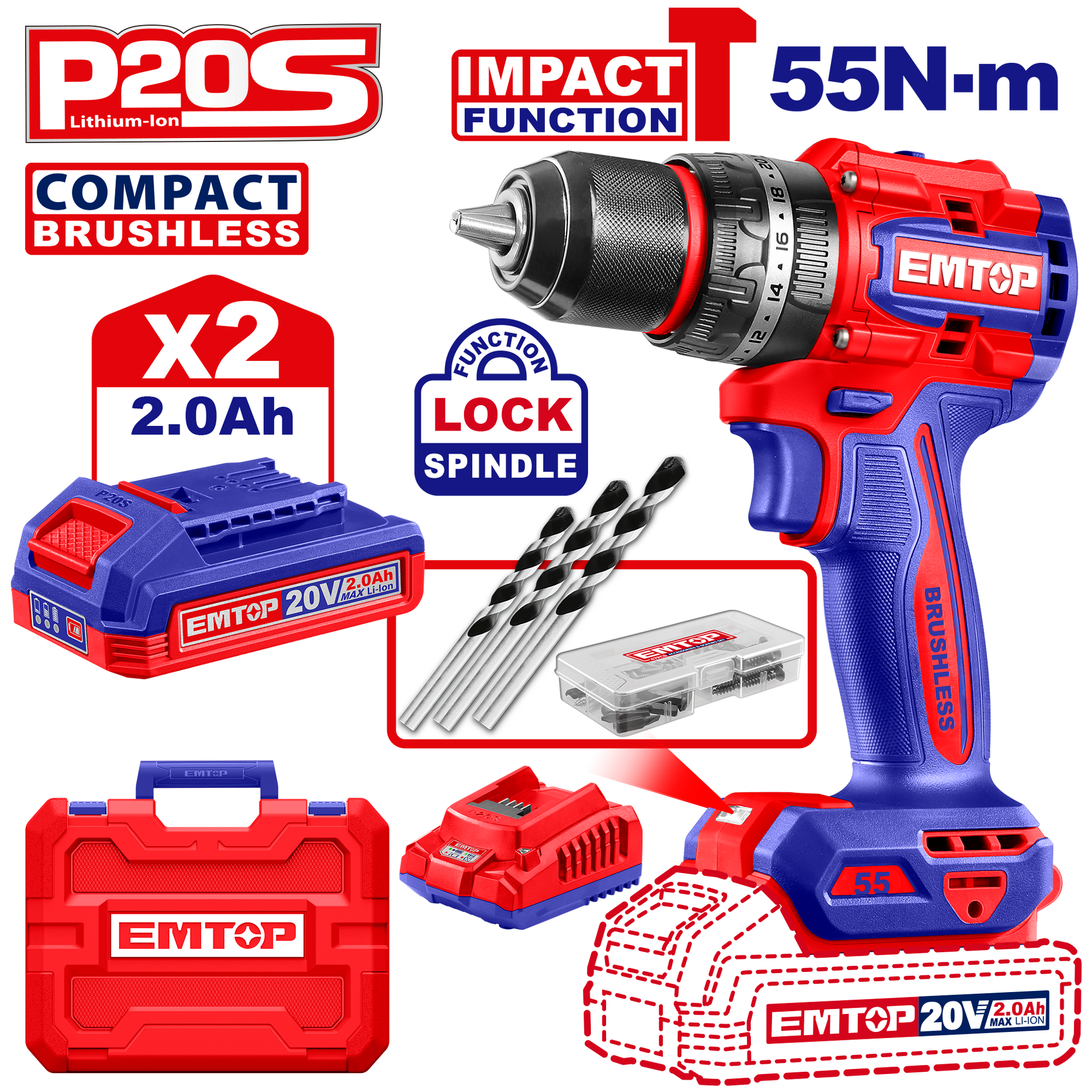 Kömürsüz Motor Gərginlik: 20V Boşda fırlanma sürəti: 0-500/0-2000 rpm Maksimum təsir tezliyi: 30000 bpm Maksimum tork: 55 Nm Metal patron Patron tutumu: 13 mm Tork ayarları: 22+1+1 Mexaniki 2 sürətli dişli Şaft kilidi funksiyası LED işıq LED batareya gücü göstəricisi Daxildir: 2 ədəd 2.0 Ah batareya paketi (EBPK20011) 1 ədəd şarj cihazı (EFCR20200) Şarj gərginliyi: 220-240V~50/60Hz 47 ədəd aksesuar 3 ədəd divar delici boru Qablaşdırma: Daşıma qutusu