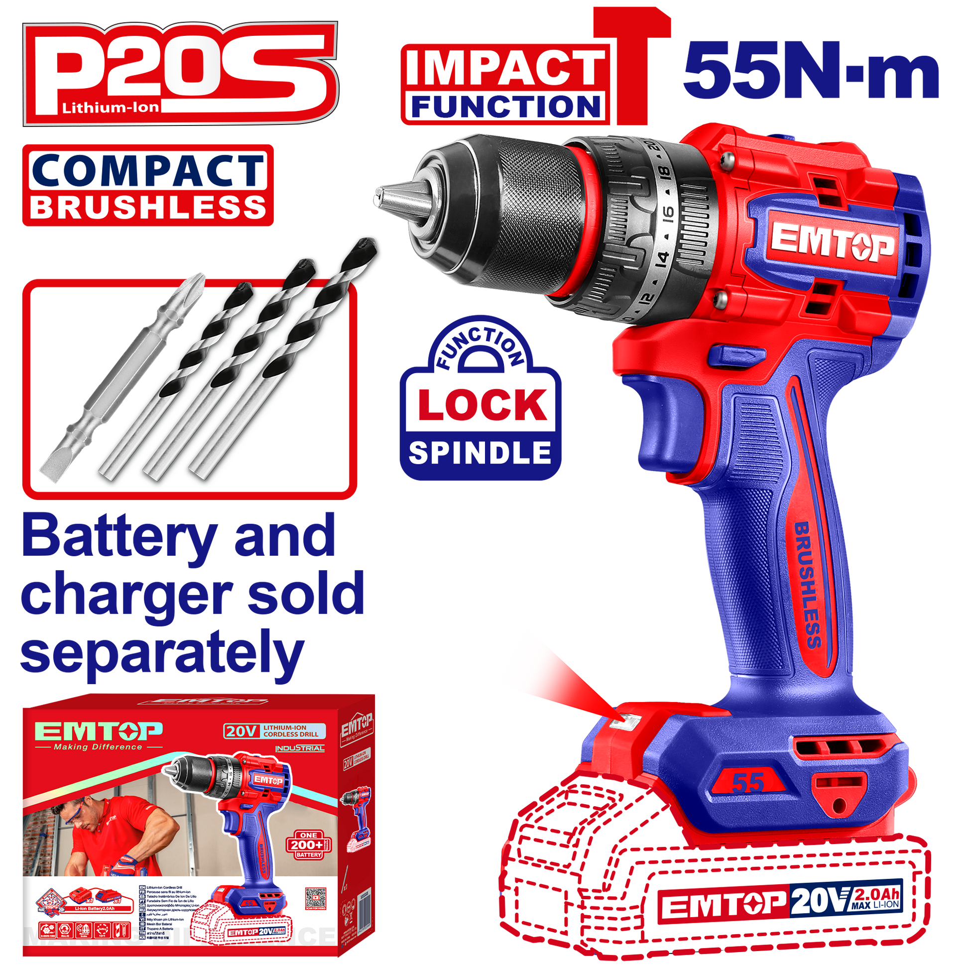 Fırçasız motorGərginlik: 20VBoş dövrə sürəti: 0-500/0-2000rpmMaksimum zərbə sayı: 30000bpmMaksimum fırlanma momenti: 55NmMetal chuckChuck tutumu: 13mmFırlanma tənzimləmələri: 22+1+1Mexaniki 2 sürətli dişliMil bağlama funksiyasıİnteqrasiya edilmiş LED iş işığıDaxildir: 1 ədəd Cr-V 65mm bit 3 ədəd daş drel başlığıBatareya və şarj cihazı ayrıca satılırRəngli qutuya yığılmışdır